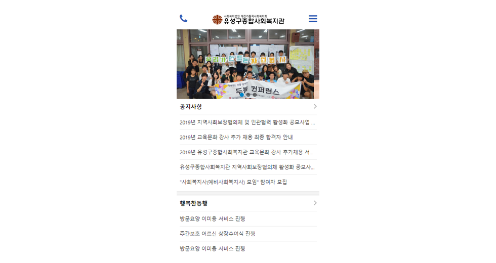 본 사이트의 컨텐츠는 무단으로 복사·게재·배포 등을 금합니다. 상세내용 게시글 본문 복지관 유성구종합사회복지관 제작기간 2018.07 홈페이지 주소 http://yuseongswc.or.kr 홈페이지 타입 Mobile web(모바일웹) 유성구종합사회복지관 디자인으로 견적상담 받기 🎁무료혜택 확인하기! 25가지 다양한 무료혜택을 확인해 보세요. 검색목록 목록