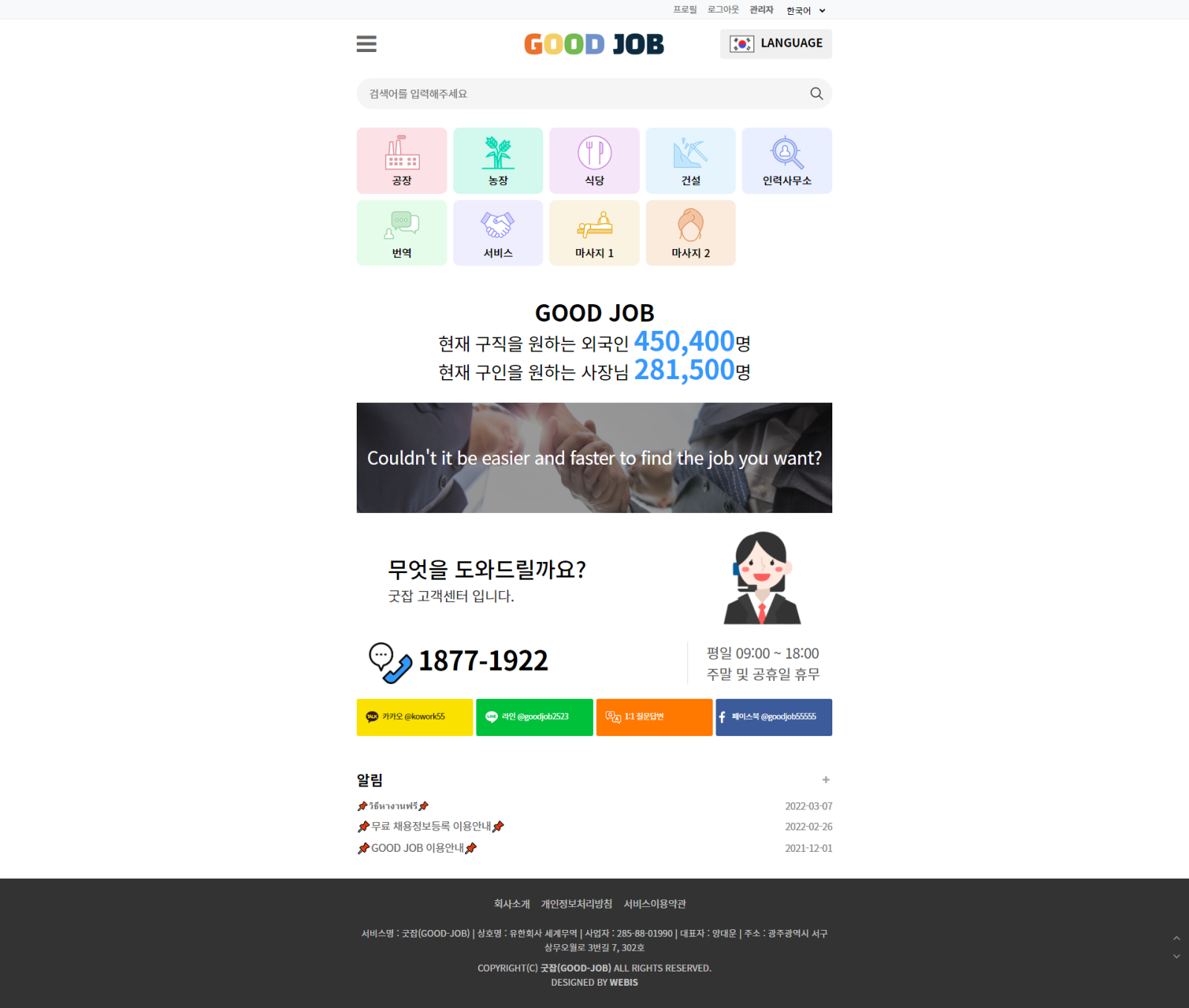 본 사이트의 컨텐츠는 무단으로 복사·게재·배포 등을 금합니다. 상세내용 게시글 본문 일반기업 굿잡 제작기간 2021.12 홈페이지 주소 https://good-job.kr 홈페이지 타입 Mobile web(모바일웹) 굿잡 디자인으로 견적상담 받기 🎁무료혜택 확인하기! 25가지 다양한 무료혜택을 확인해 보세요. 검색목록 목록