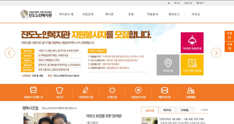 본 사이트의 컨텐츠는 무단으로 복사·게재·배포 등을 금합니다. 상세내용 게시글 본문 복지관 진도노인복지관 제작기간 2015.02 홈페이지 주소 http://jdnoin.or.kr 홈페이지 타입 Website(웹사이트) 진도노인복지관 디자인으로 견적상담 받기 🎁무료혜택 확인하기! 25가지 다양한 무료혜택을 확인해 보세요. 검색목록 목록