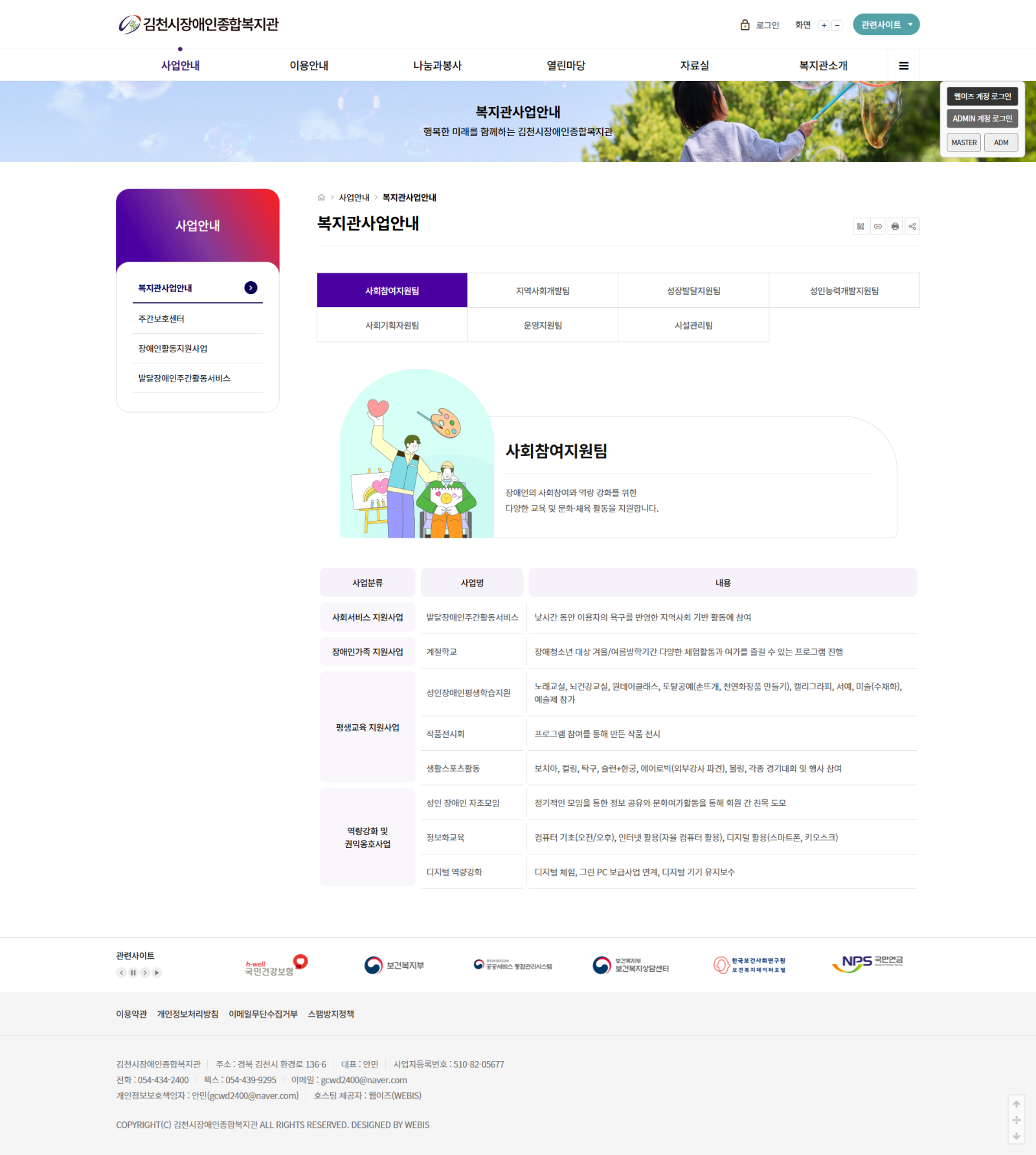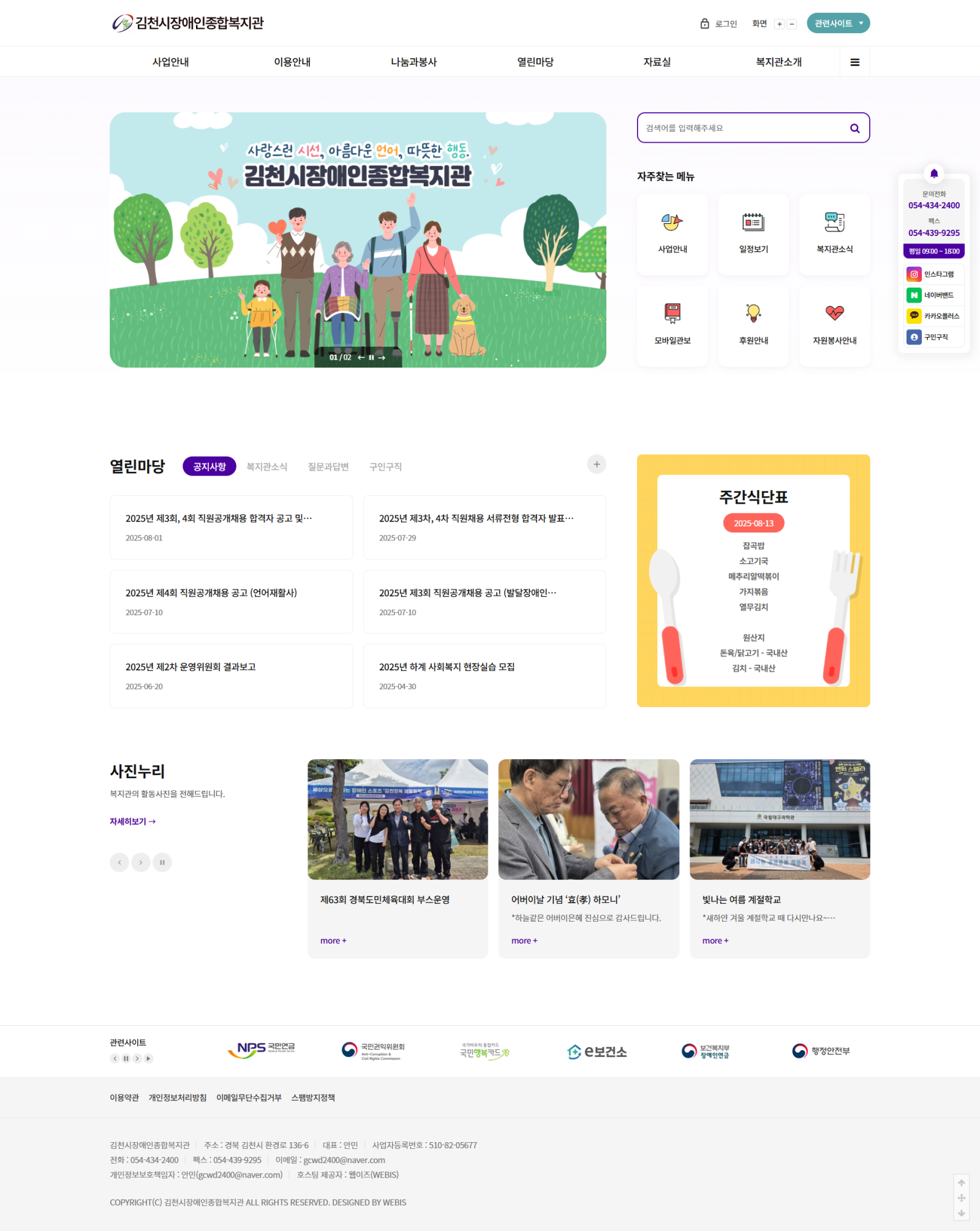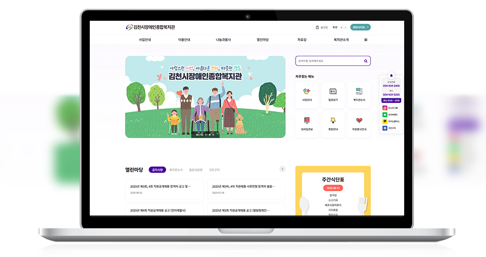 본 사이트의 컨텐츠는 무단으로 복사·게재·배포 등을 금합니다. 상세내용 게시글 본문 복지관 김천시장애인복지관 제작기간 2025.04 홈페이지 주소 http://gcwd.or.kr/ 홈페이지 타입 Responsible website(반응형웹) 김천시장애인복지관 디자인으로 견적상담 받기 🎁무료혜택 확인하기! 25가지 다양한 무료혜택을 확인해 보세요. 검색목록 목록