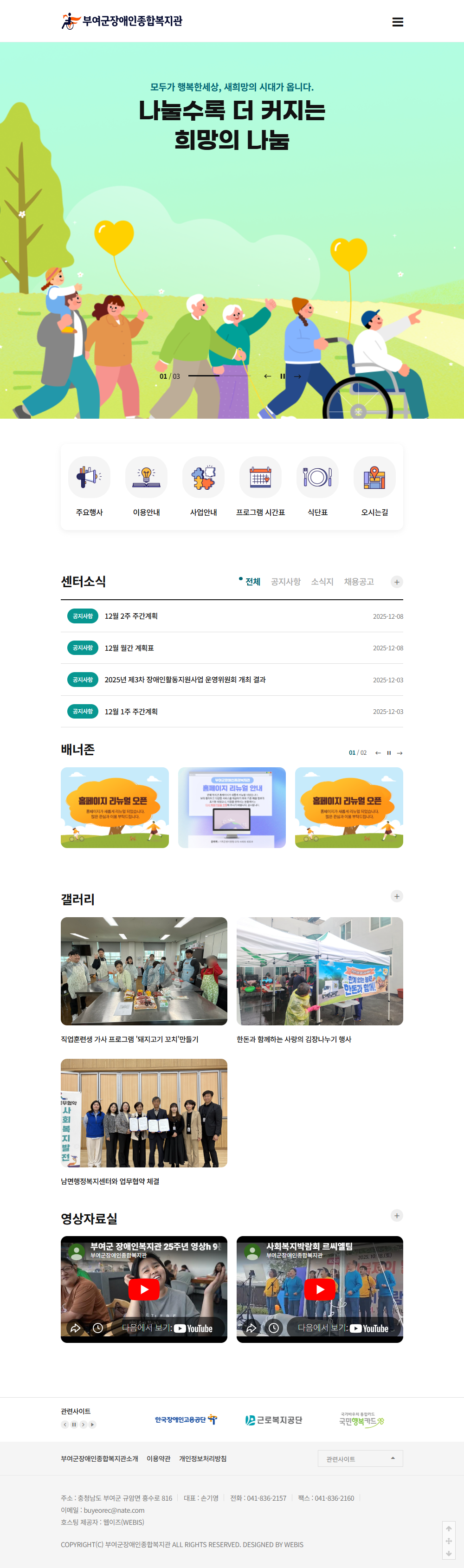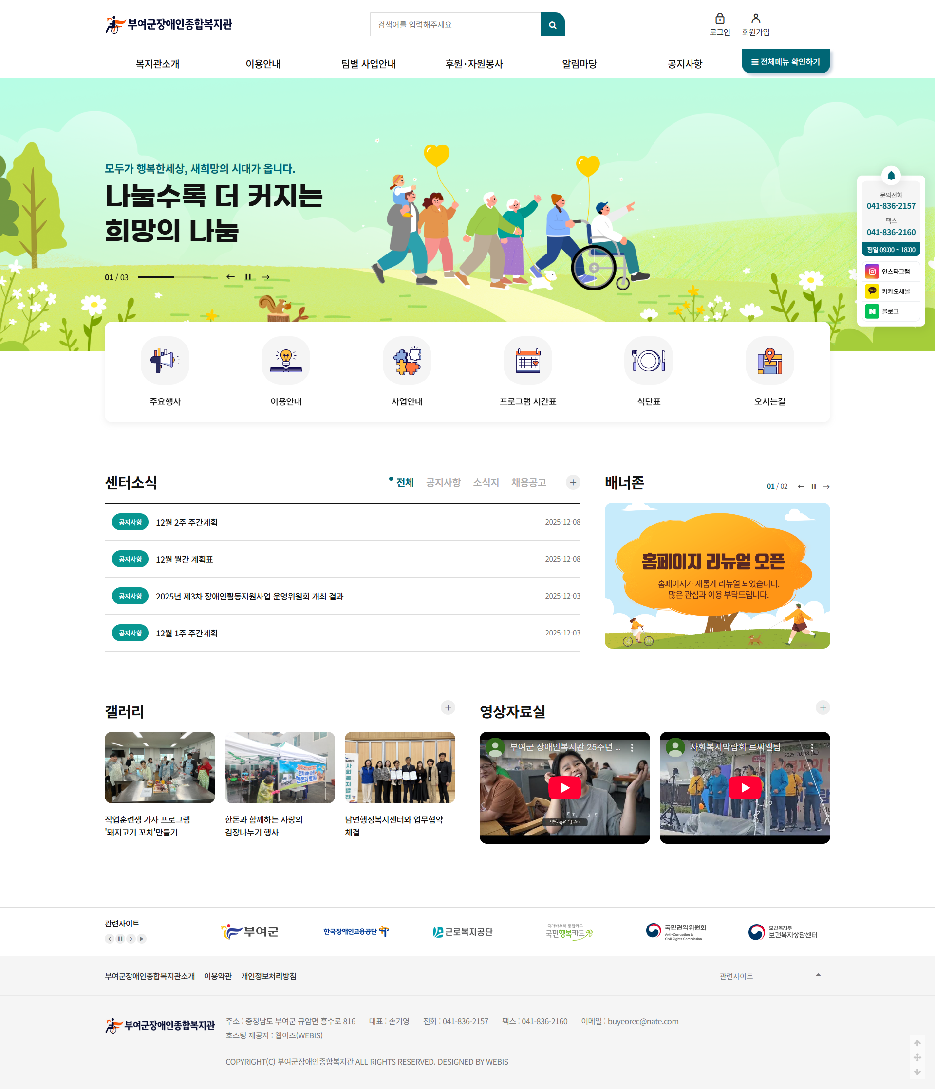 본 사이트의 컨텐츠는 무단으로 복사·게재·배포 등을 금합니다. PC 미리보기 태블릿 미리보기 모바일 미리보기 복지관 부여군장애인종합복지관 제작기간 2025.08.20~2025.09.12 홈페이지 주소 http://buyeorec.or.kr/ 홈페이지 타입 반응형 홈페이지 프로그램 기능 후원신청, 자원봉사 신청 디자인 컨셉 가족같은 분위기와 선명한 색감의 홈페이지 부여군장애인종합복지관 디자인으로 견적상담 받기 🎁무료혜택 확인하기! 25가지 다양한 무료혜택을 확인해 보세요. 목록
