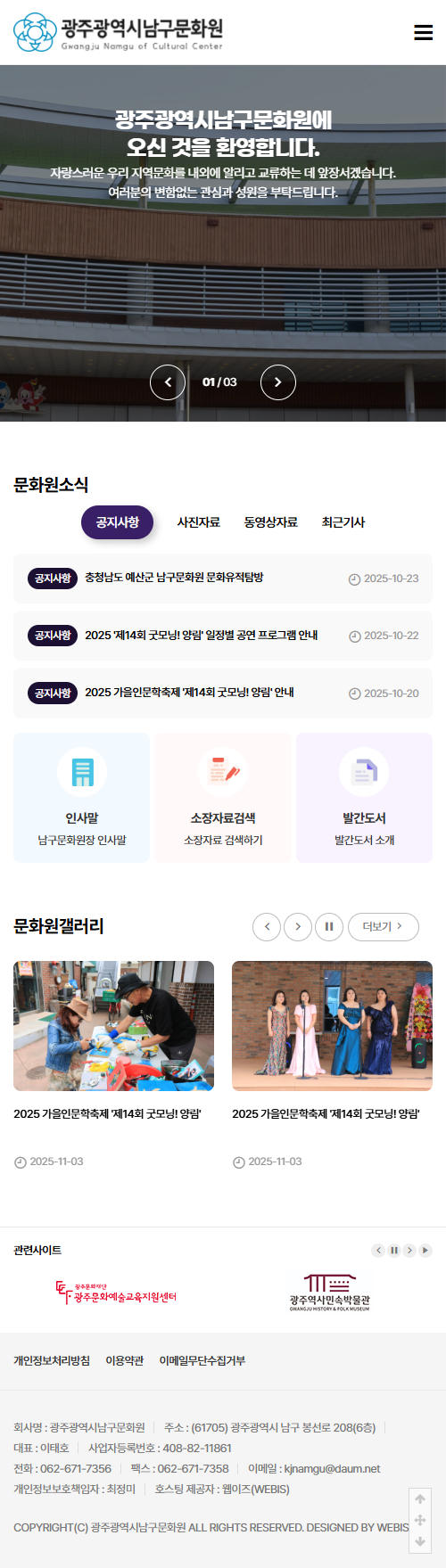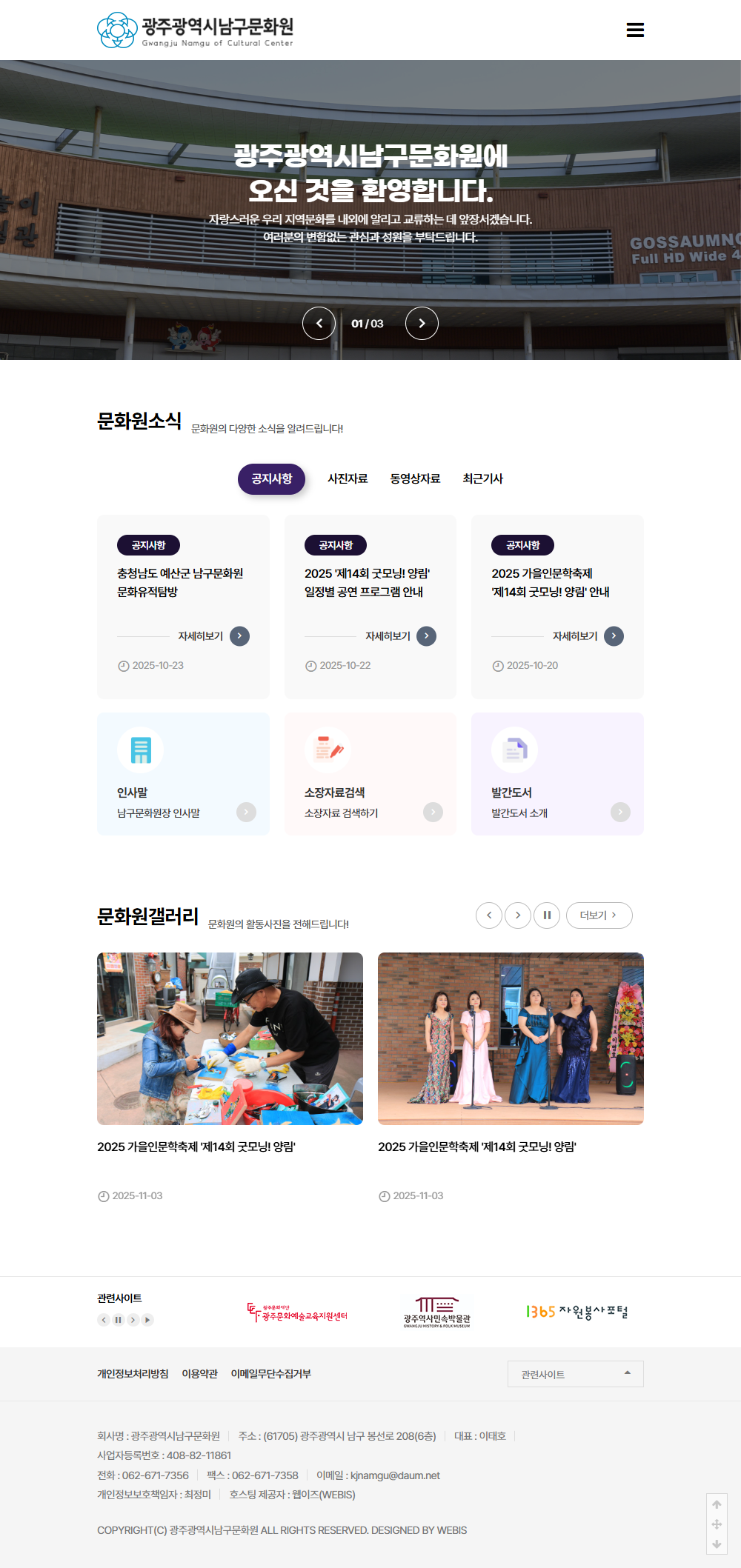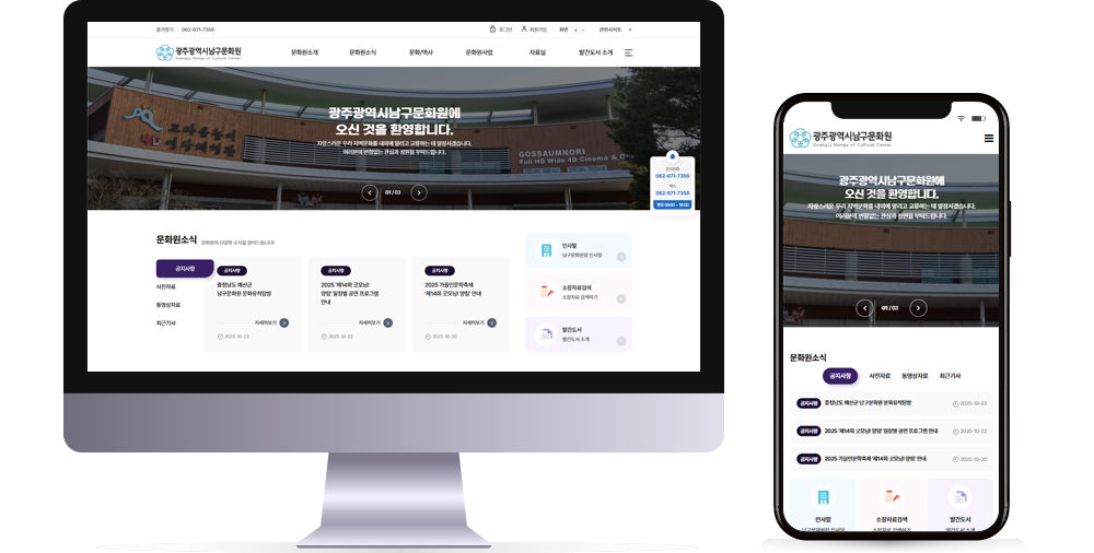 본 사이트의 컨텐츠는 무단으로 복사·게재·배포 등을 금합니다. PC 미리보기 태블릿 미리보기 모바일 미리보기 단체협회 광주남구문화원 제작기간 2025.12.23~2025.12.30 홈페이지 주소 http://kjnamgu.co.kr 홈페이지 타입 반응형 홈페이지 프로그램 기능 문화재 등록 디자인 컨셉 지역 문화의 온기와 일상을 담아, 누구나 편안하게 소통하는 열린 문화공간의 분위기 광주남구문화원 디자인으로 견적상담 받기 🎁무료혜택 확인하기! 25가지 다양한 무료혜택을 확인해 보세요. 목록