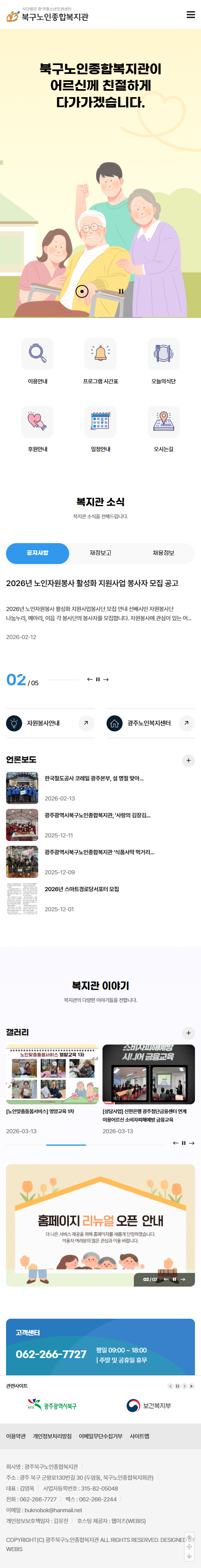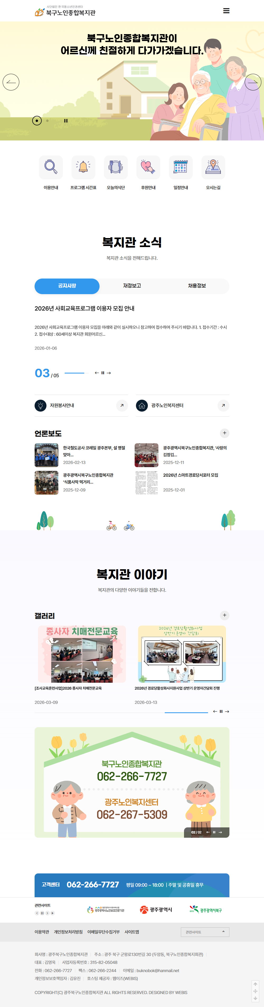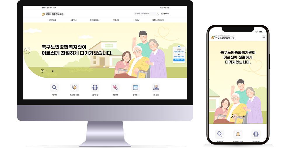 본 사이트의 컨텐츠는 무단으로 복사·게재·배포 등을 금합니다. PC 미리보기 태블릿 미리보기 모바일 미리보기 복지관 북구노인종합복지관 제작기간 2025.12.19~2026.02.02 홈페이지 주소 https://buknobok.or.kr 홈페이지 타입 반응형 홈페이지 프로그램 기능 후원신청, 자원봉사 신청 디자인 컨셉 어르신을 위한 다양한 복지 서비스와 소식을 쉽고 따뜻하게 전하는 소통형 홈페이지 북구노인종합복지관 디자인으로 견적상담 받기 🎁무료혜택 확인하기! 25가지 다양한 무료혜택을 확인해 보세요. 목록
