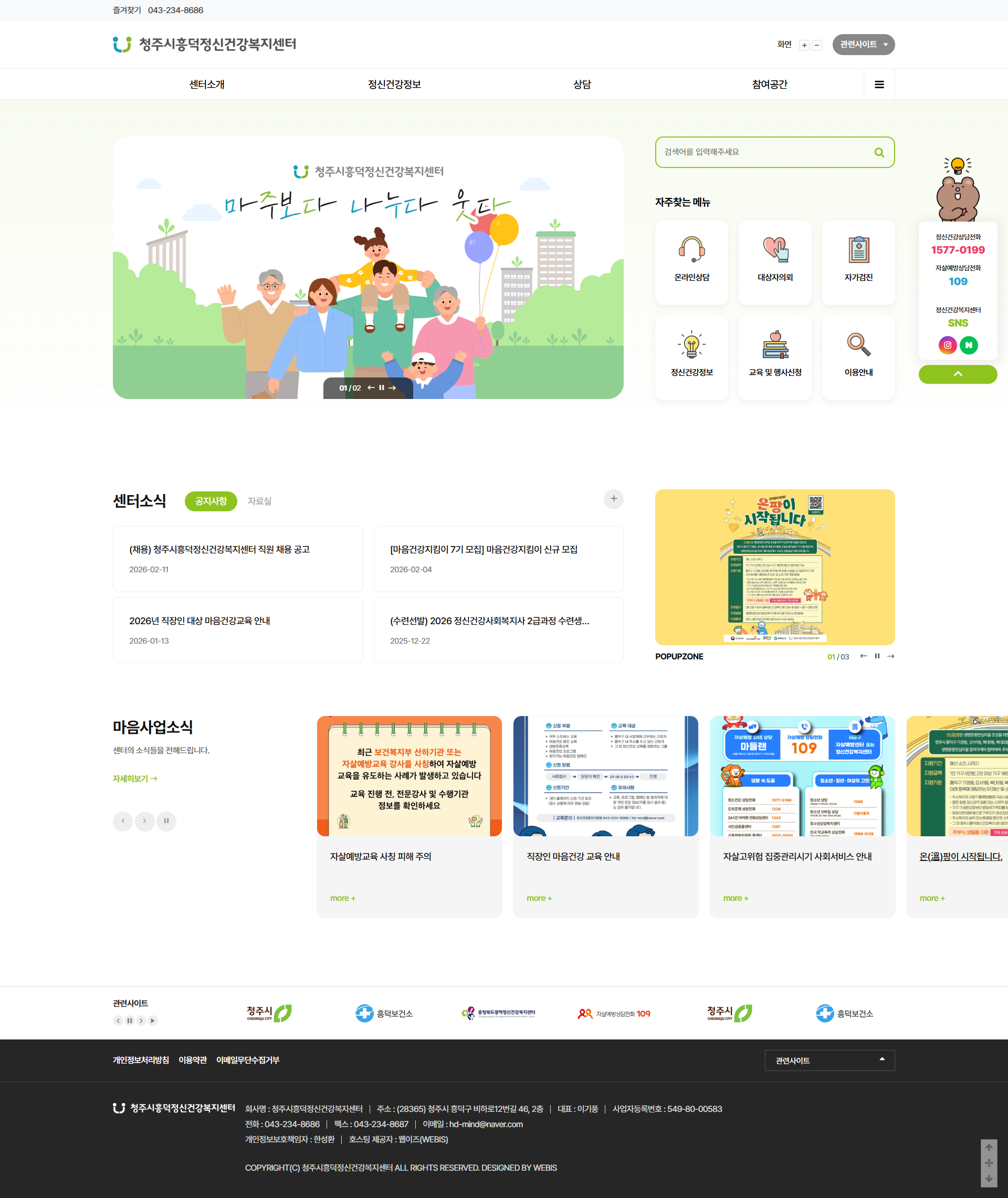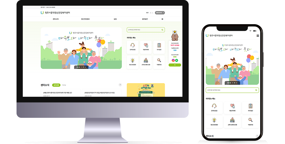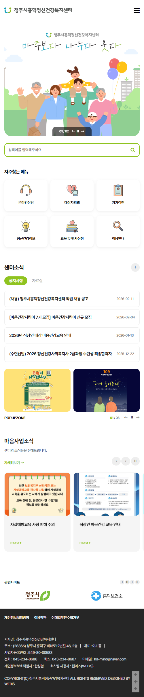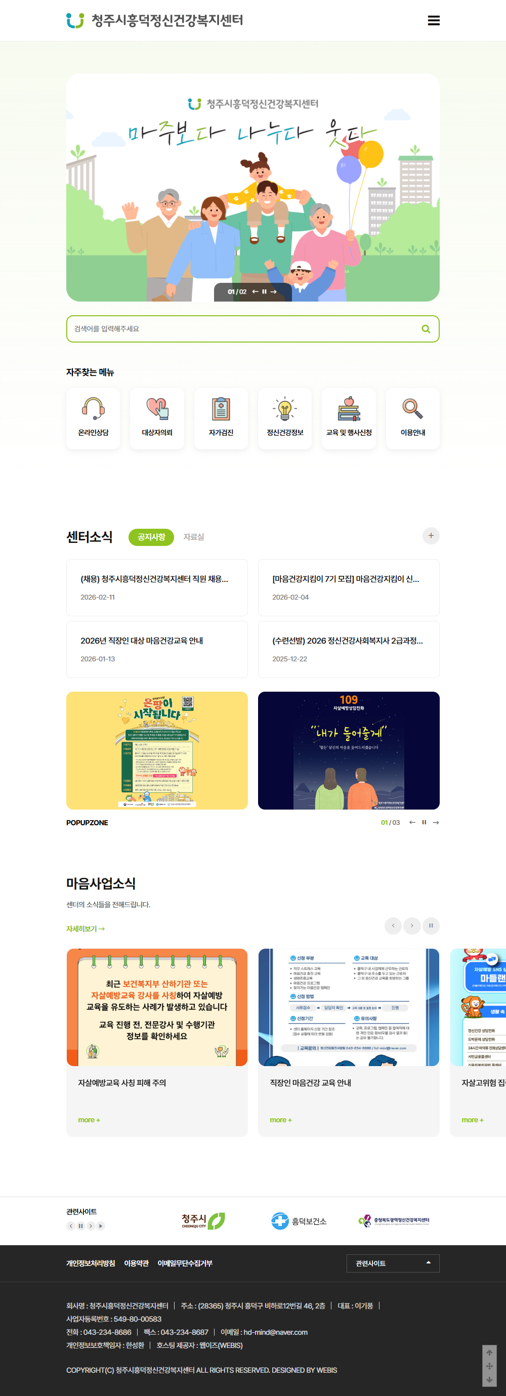 본 사이트의 컨텐츠는 무단으로 복사·게재·배포 등을 금합니다. PC 미리보기 태블릿 미리보기 모바일 미리보기 복지관 청주시흥덕정신건강복지센터 제작기간 2026.02.11~2026.03.06 홈페이지 주소 http://hdmind.co.kr 홈페이지 타입 반응형 홈페이지 프로그램 기능 온라인 상담, 정신건강서비스의뢰, 자가검진, 교육 및 행사신청 디자인 컨셉 마음을 돌보고 함께 회복하는 따뜻한 정신건강 지원 플랫폼 청주시흥덕정신건강복지센터 디자인으로 견적상담 받기 🎁무료혜택 확인하기! 25가지 다양한 무료혜택을 확인해 보세요. 목록