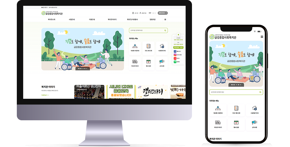 본 사이트의 컨텐츠는 무단으로 복사·게재·배포 등을 금합니다. PC 미리보기 태블릿 미리보기 모바일 미리보기 복지관 금강종합사회복지관 제작기간 2026.03.11~2026.03.23 홈페이지 주소 https://geumgang.or.kr 홈페이지 타입 반응형 홈페이지 프로그램 기능 후원신청, 자원봉사 신청, 대관신청, 프로그램 신청 등 디자인 컨셉 따뜻한 일상과 나눔의 가치를 담아 누구나 편안하게 이용할 수 있는 복지 중심 공간 금강종합사회복지관 디자인으로 견적상담 받기 🎁무료혜택 확인하기! 25가지 다양한 무료혜택을 확인해 보세요. 목록