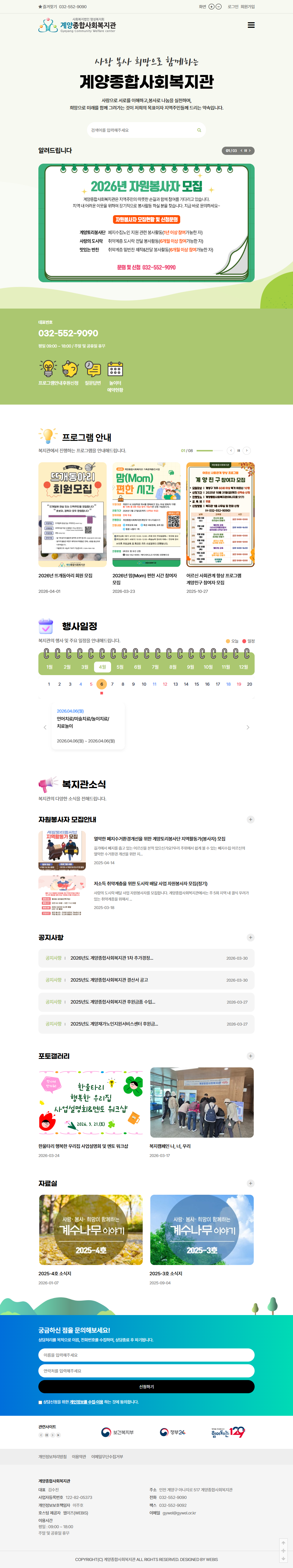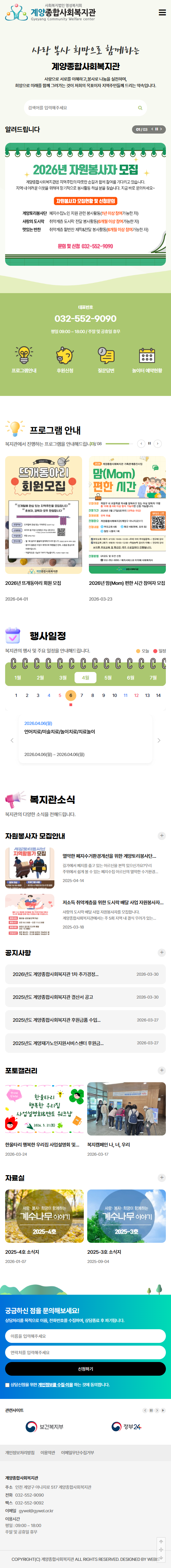 본 사이트의 컨텐츠는 무단으로 복사·게재·배포 등을 금합니다. PC 미리보기 태블릿 미리보기 모바일 미리보기 복지관 계양종합사회복지관 제작기간 2026.03.23~2026.04.06 홈페이지 주소 https://gywel.or.kr 홈페이지 타입 반응형 홈페이지 프로그램 기능 후원신청, 자원봉사 신청 등 디자인 컨셉 지역과 이웃을 잇는 따뜻한 소통과 나눔의 복지 플랫폼 계양종합사회복지관 디자인으로 견적상담 받기 🎁무료혜택 확인하기! 25가지 다양한 무료혜택을 확인해 보세요. 목록