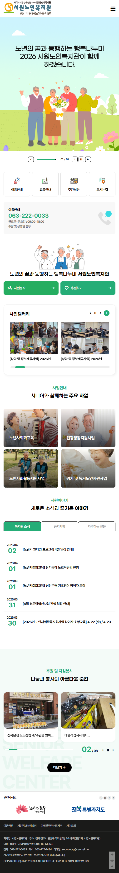 본 사이트의 컨텐츠는 무단으로 복사·게재·배포 등을 금합니다. PC 미리보기 태블릿 미리보기 모바일 미리보기 복지관 서원노인복지관 제작기간 2026.03.06~2026.04.09 홈페이지 주소 https://swsilver.org/ 홈페이지 타입 반응형 홈페이 프로그램 기능 후원신청, 자원봉사 신청 디자인 컨셉 노년의 삶을 함께하며 어르신들에게 따뜻한 행복과 활력을 전하는 복지관 서원노인복지관 디자인으로 견적상담 받기 🎁무료혜택 확인하기! 25가지 다양한 무료혜택을 확인해 보세요. 목록