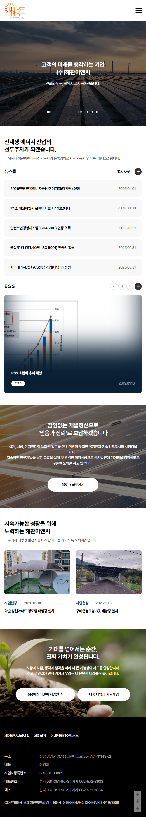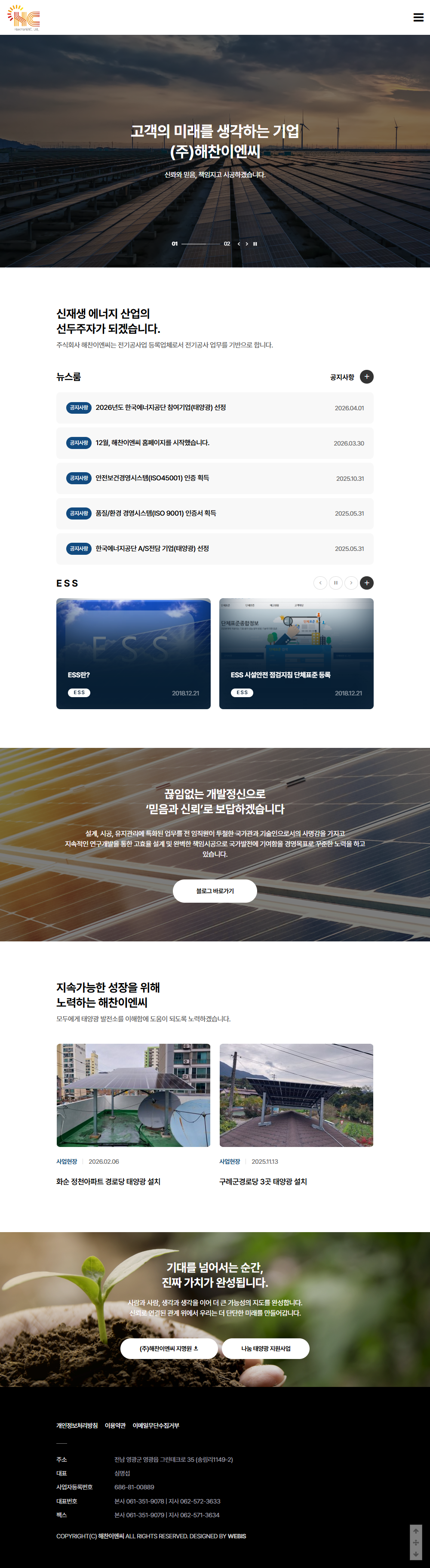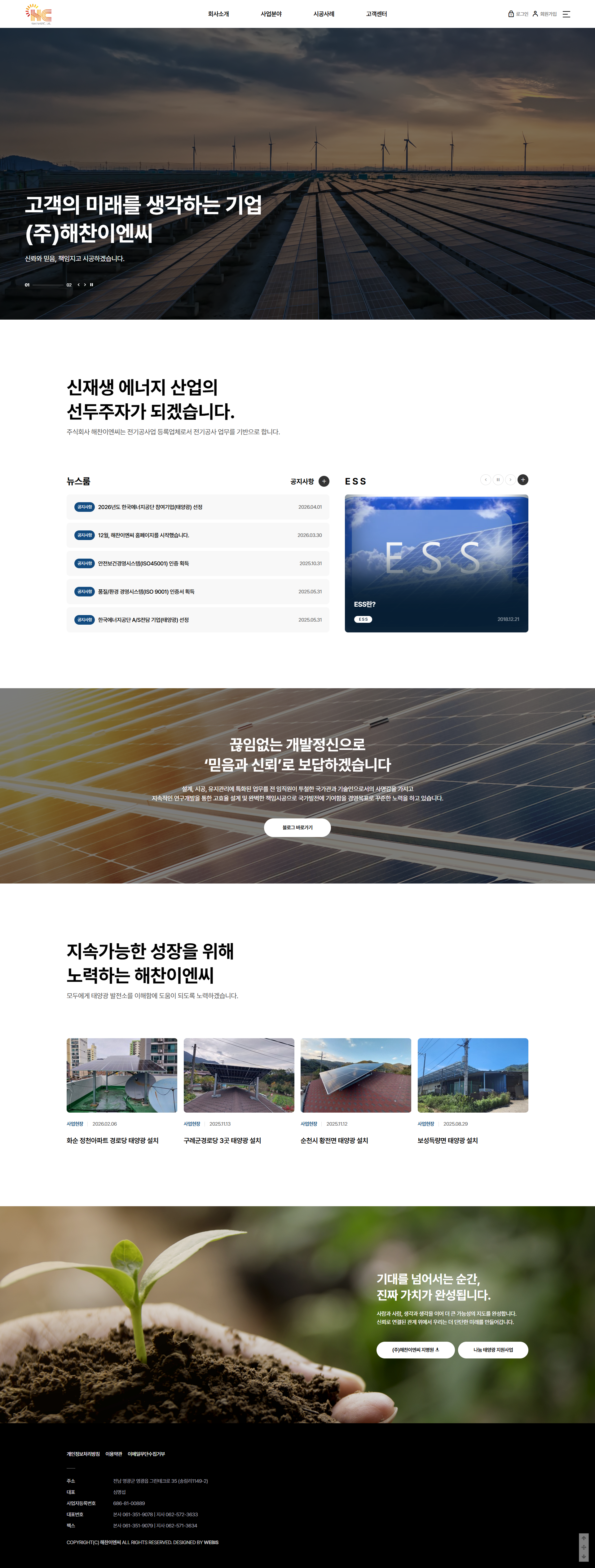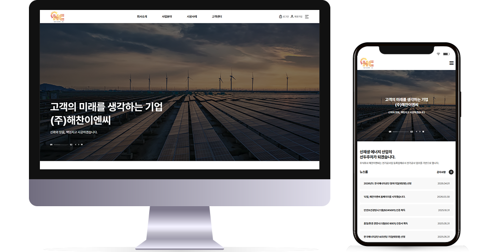 본 사이트의 컨텐츠는 무단으로 복사·게재·배포 등을 금합니다. PC 미리보기 태블릿 미리보기 모바일 미리보기 일반기업 해찬이엔씨 제작기간 2026.03.26~2026.04.16 홈페이지 주소 https://xn--od5b9lh4bb8io1n.kr/ 홈페이지 타입 반응형 홈페이지 디자인 컨셉 태양광 패널 이미지 등 사진을 중심으로 한 시각 중심 디자인 해찬이엔씨 디자인으로 견적상담 받기 🎁무료혜택 확인하기! 25가지 다양한 무료혜택을 확인해 보세요. 목록