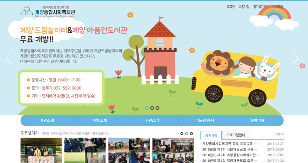 본 사이트의 컨텐츠는 무단으로 복사·게재·배포 등을 금합니다. 상세내용 게시글 본문 복지관 계양종합사회복지관 제작기간 2018.03 홈페이지 주소 http://gywel.or.kr 홈페이지 타입 Website(웹사이트) / Mobile web(모바일웹) 계양종합사회복지관 디자인으로 견적상담 받기 🎁무료혜택 확인하기! 25가지 다양한 무료혜택을 확인해 보세요. 검색목록 목록