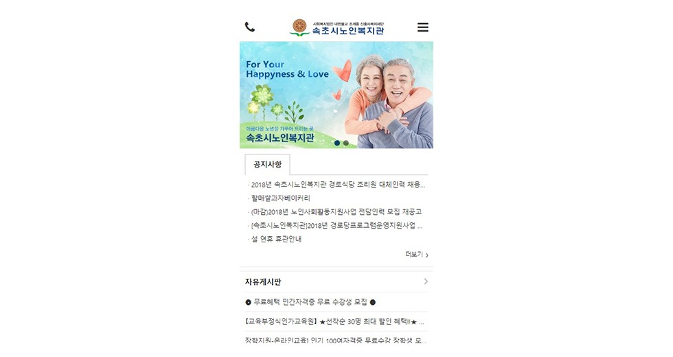 본 사이트의 컨텐츠는 무단으로 복사·게재·배포 등을 금합니다. 상세내용 게시글 본문 복지관 속초시노인복지관 제작기간 2018.03 홈페이지 주소 http://sswc.or.kr/ 홈페이지 타입 Mobile web(모바일웹) 속초시노인복지관 디자인으로 견적상담 받기 🎁무료혜택 확인하기! 25가지 다양한 무료혜택을 확인해 보세요. 검색목록 목록