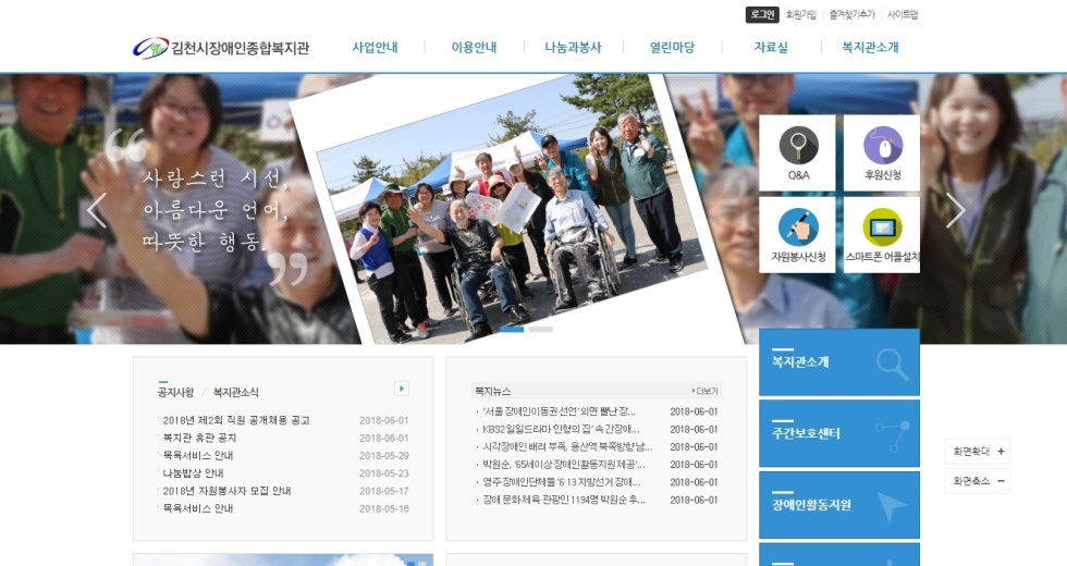 본 사이트의 컨텐츠는 무단으로 복사·게재·배포 등을 금합니다. 상세내용 게시글 본문 복지관 김천시장애인종합복지관 제작기간 2018.05 홈페이지 주소 http://gcwd.or.kr/ 홈페이지 타입 Website(웹사이트) / Mobile web(모바일웹) 김천시장애인종합복지관 디자인으로 견적상담 받기 🎁무료혜택 확인하기! 25가지 다양한 무료혜택을 확인해 보세요. 검색목록 목록