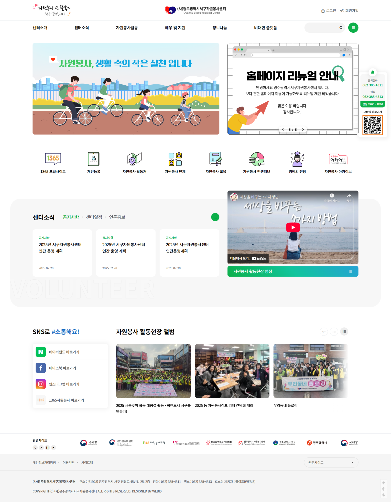 본 사이트의 컨텐츠는 무단으로 복사·게재·배포 등을 금합니다. 상세내용 게시글 본문 복지관 광주서구자원봉사센터 제작기간 2025.03 홈페이지 주소 https://sgvc1365.kr 홈페이지 타입 광주서구자원봉사센터 광주서구자원봉사센터 디자인으로 견적상담 받기 🎁무료혜택 확인하기! 25가지 다양한 무료혜택을 확인해 보세요. 검색목록 목록