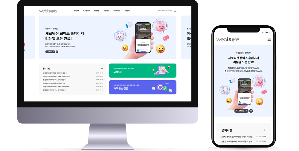 본 사이트의 컨텐츠는 무단으로 복사·게재·배포 등을 금합니다. PC 미리보기 태블릿 미리보기 모바일 미리보기 일반기업 웹이즈 제작기간 2025.08.12~2025.09.19 홈페이지 주소 https://www.webis.co.kr/ 홈페이지 타입 반응형 홈페이지 프로그램 기능 견적 및 상담 신청 웹이즈 디자인으로 견적상담 받기 🎁무료혜택 확인하기! 25가지 다양한 무료혜택을 확인해 보세요. 목록