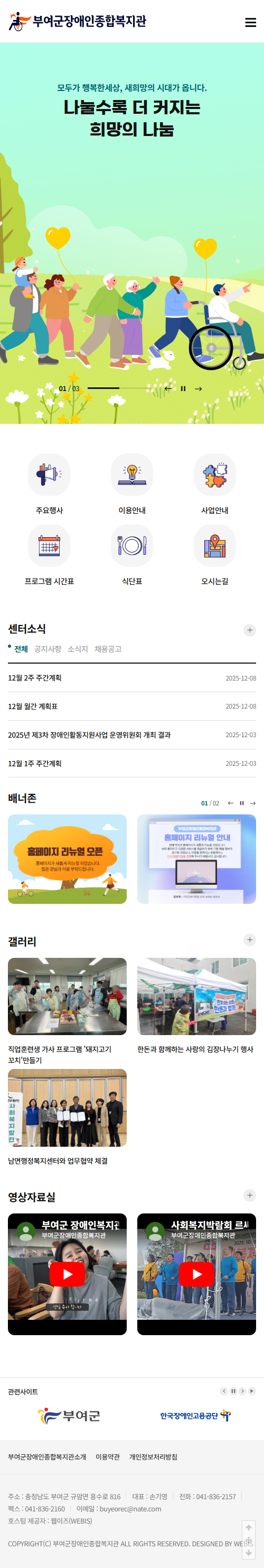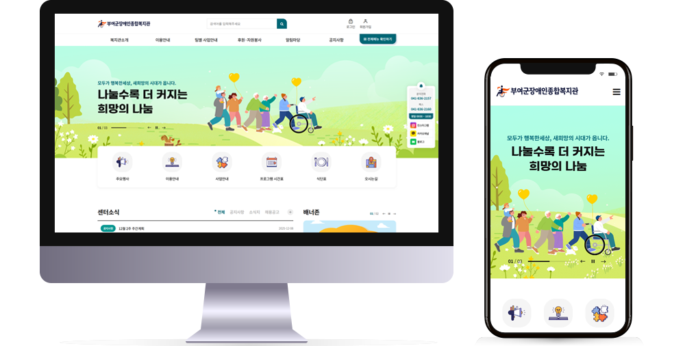 본 사이트의 컨텐츠는 무단으로 복사·게재·배포 등을 금합니다. PC 미리보기 태블릿 미리보기 모바일 미리보기 복지관 부여군장애인종합복지관 제작기간 2025.08.20~2025.09.12 홈페이지 주소 http://buyeorec.or.kr/ 홈페이지 타입 반응형 홈페이지 프로그램 기능 후원신청, 자원봉사 신청 디자인 컨셉 가족같은 분위기와 선명한 색감의 홈페이지 부여군장애인종합복지관 디자인으로 견적상담 받기 🎁무료혜택 확인하기! 25가지 다양한 무료혜택을 확인해 보세요. 목록