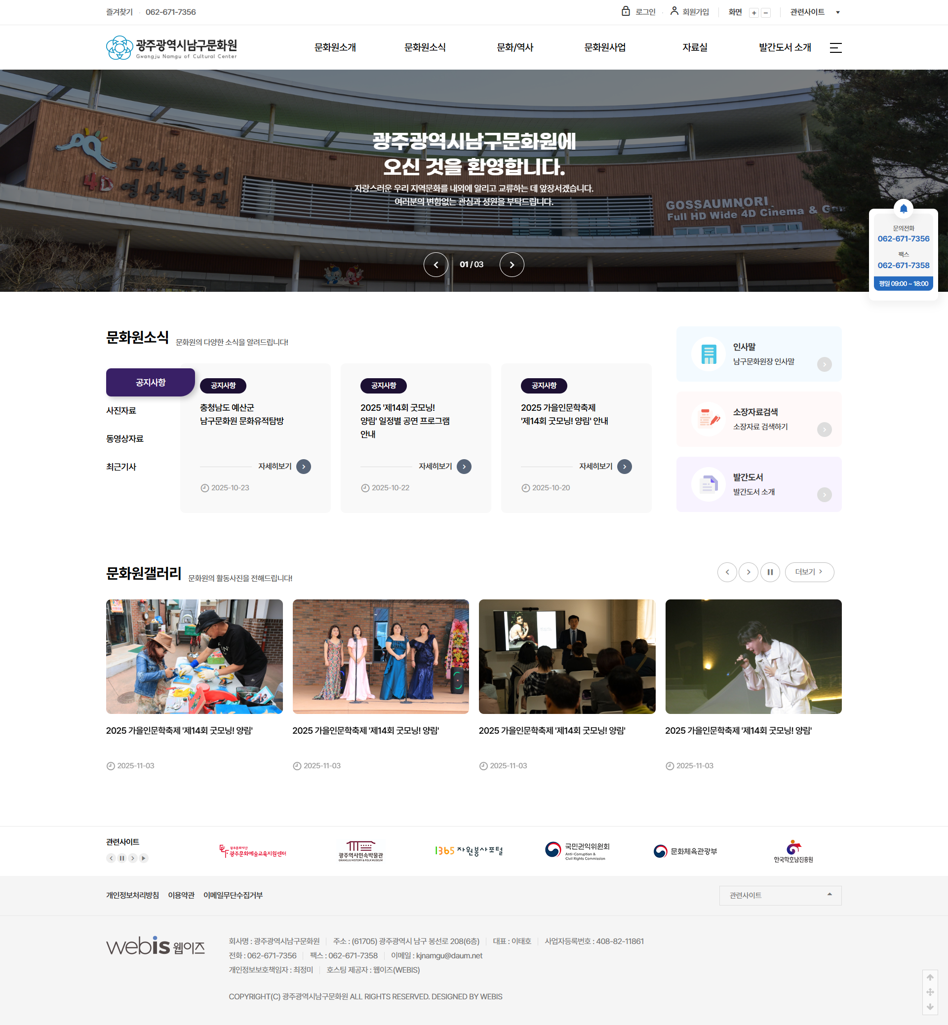 본 사이트의 컨텐츠는 무단으로 복사·게재·배포 등을 금합니다. PC 미리보기 태블릿 미리보기 모바일 미리보기 단체협회 광주남구문화원 제작기간 2025.12.23~2025.12.30 홈페이지 주소 http://kjnamgu.co.kr 홈페이지 타입 반응형 홈페이지 프로그램 기능 문화재 등록 디자인 컨셉 지역 문화의 온기와 일상을 담아, 누구나 편안하게 소통하는 열린 문화공간의 분위기 광주남구문화원 디자인으로 견적상담 받기 🎁무료혜택 확인하기! 25가지 다양한 무료혜택을 확인해 보세요. 목록