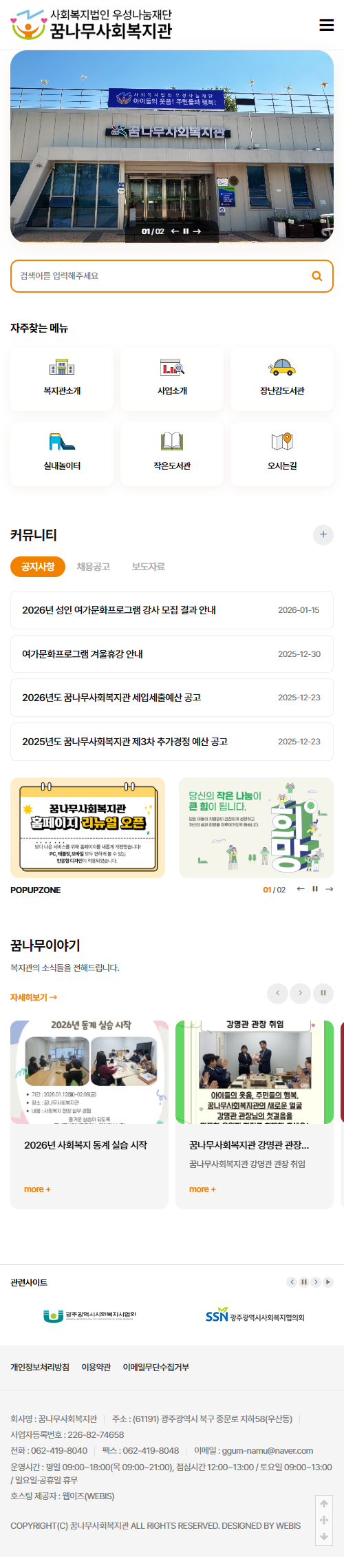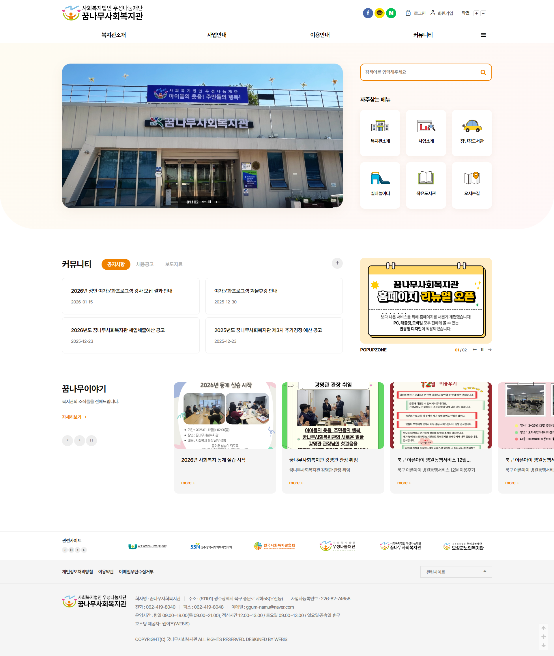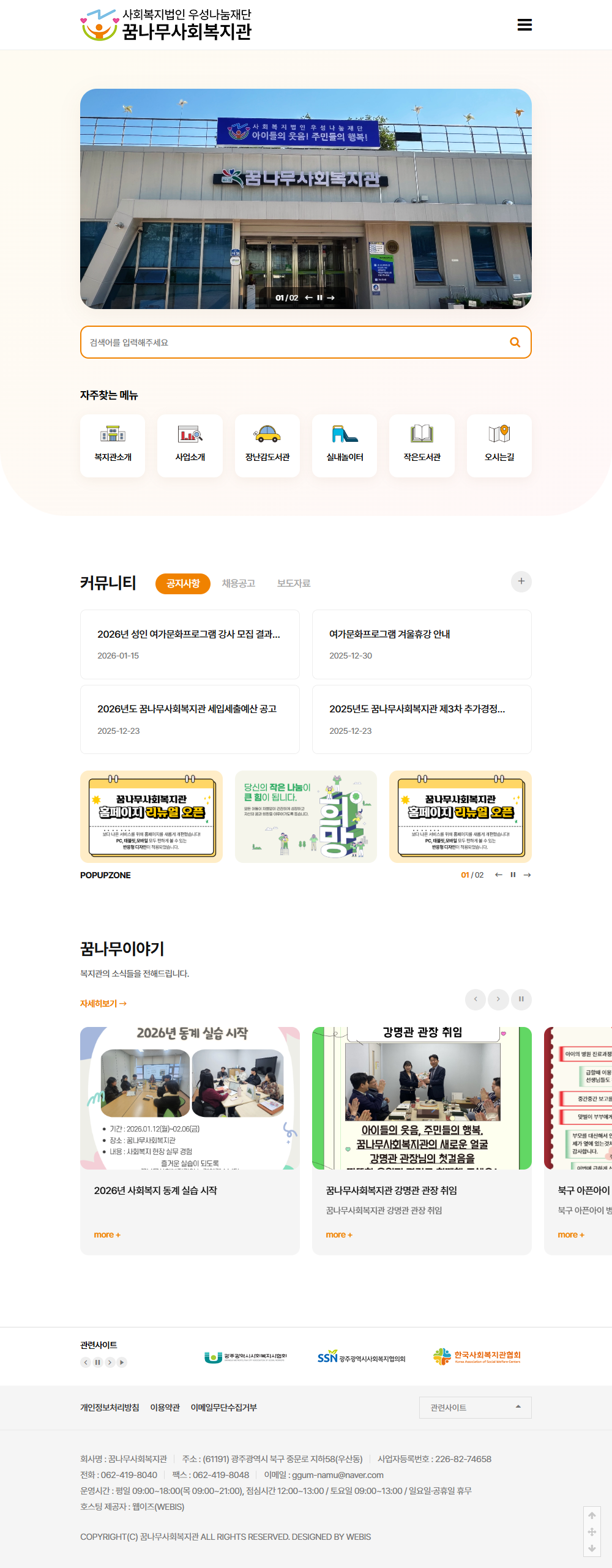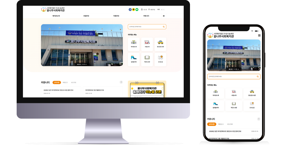 본 사이트의 컨텐츠는 무단으로 복사·게재·배포 등을 금합니다. PC 미리보기 태블릿 미리보기 모바일 미리보기 복지관 꿈나무사회복지관 제작기간 2025.12.26~2026.01.21 홈페이지 주소 https://www.ggumnamu.or.kr/ 홈페이지 타입 반응형 홈페이지 프로그램 기능 장난감 대여, 실내놀이터 예약, 대관·기관방문 신청 등 디자인 컨셉 따뜻한 지역 공동체의 가치를 담아, 누구나 쉽고 편안하게 이용할 수 있는 친근한 분위기 꿈나무사회복지관 디자인으로 견적상담 받기 🎁무료혜택 확인하기! 25가지 다양한 무료혜택을 확인해 보세요. 목록