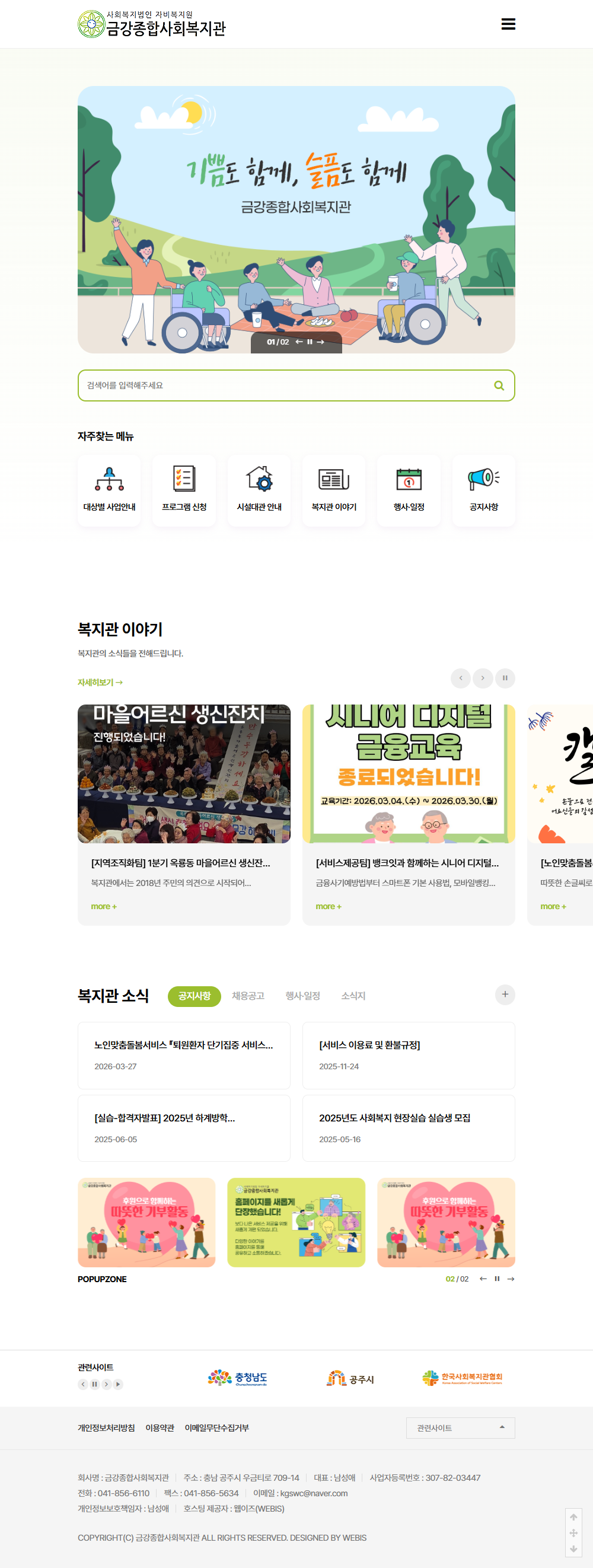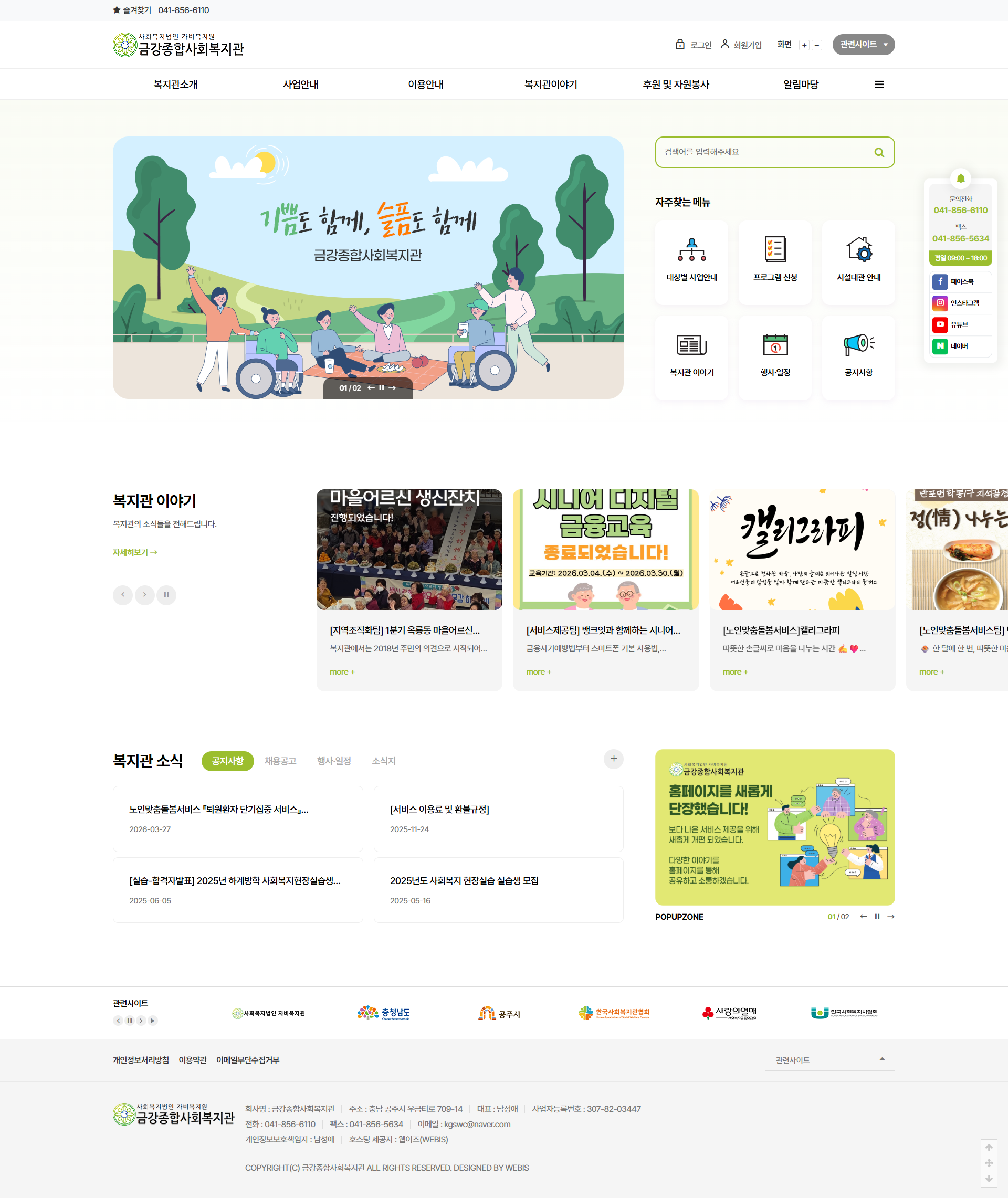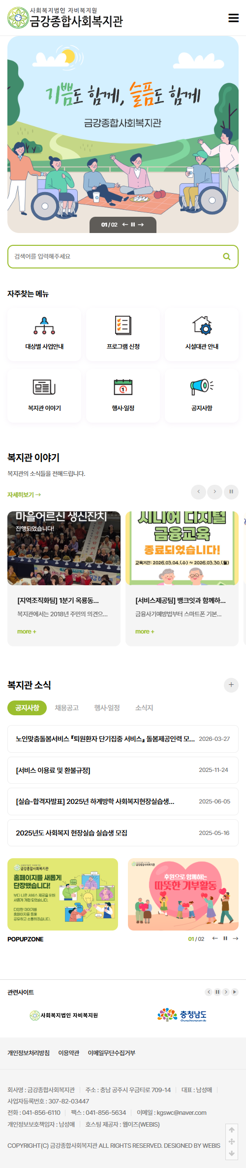 본 사이트의 컨텐츠는 무단으로 복사·게재·배포 등을 금합니다. PC 미리보기 태블릿 미리보기 모바일 미리보기 복지관 금강종합사회복지관 제작기간 2026.03.11~2026.03.23 홈페이지 주소 https://geumgang.or.kr 홈페이지 타입 반응형 홈페이지 프로그램 기능 후원신청, 자원봉사 신청, 대관신청, 프로그램 신청 등 디자인 컨셉 따뜻한 일상과 나눔의 가치를 담아 누구나 편안하게 이용할 수 있는 복지 중심 공간 금강종합사회복지관 디자인으로 견적상담 받기 🎁무료혜택 확인하기! 25가지 다양한 무료혜택을 확인해 보세요. 목록
