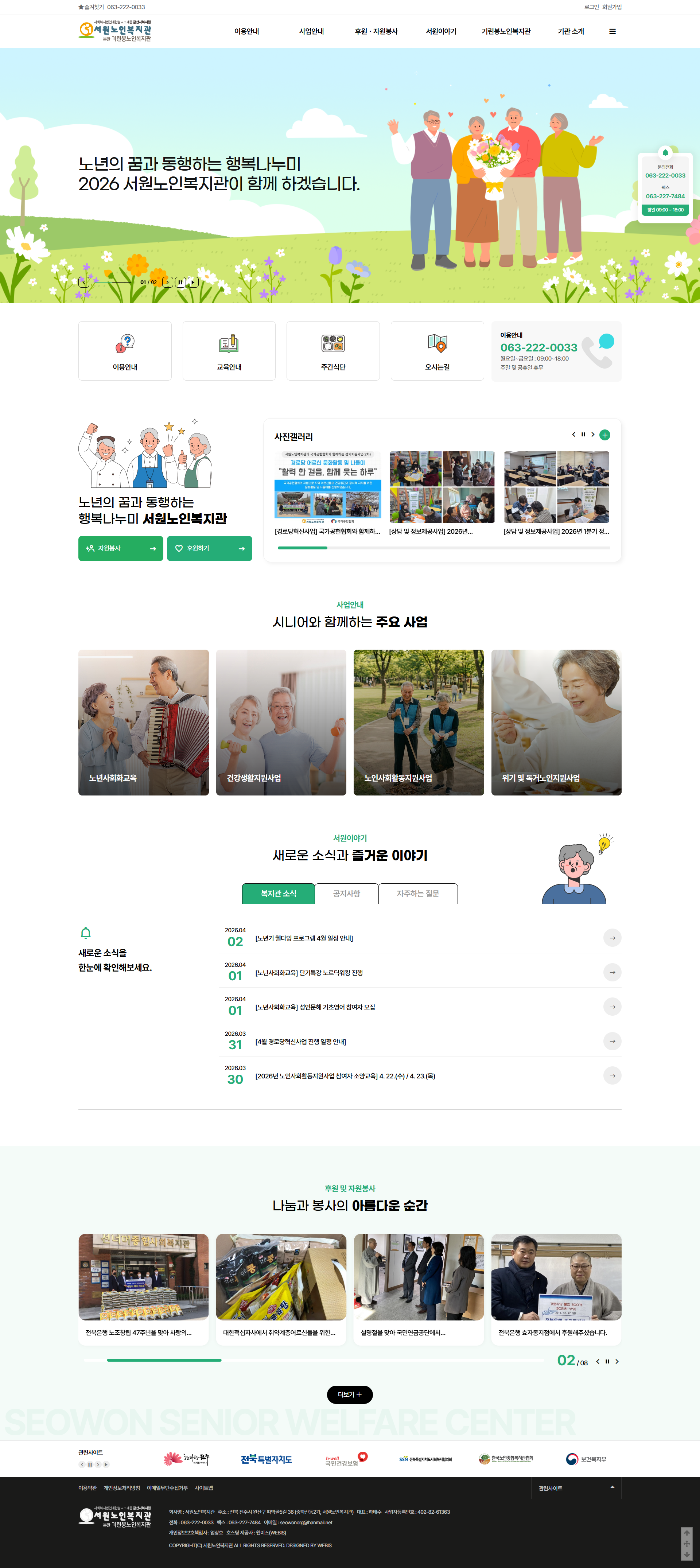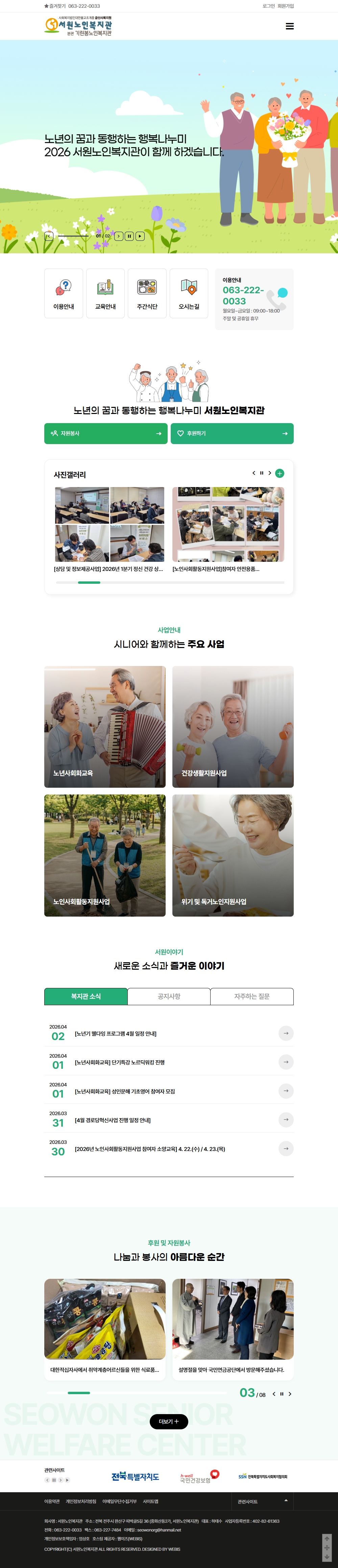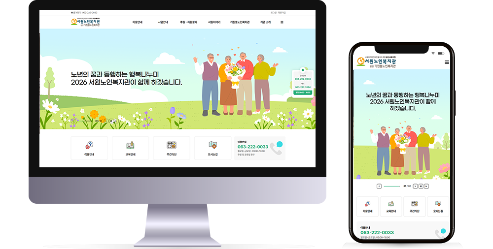 본 사이트의 컨텐츠는 무단으로 복사·게재·배포 등을 금합니다. PC 미리보기 태블릿 미리보기 모바일 미리보기 복지관 서원노인복지관 제작기간 2026.03.06~2026.04.09 홈페이지 주소 https://swsilver.org/ 홈페이지 타입 반응형 홈페이 프로그램 기능 후원신청, 자원봉사 신청 디자인 컨셉 노년의 삶을 함께하며 어르신들에게 따뜻한 행복과 활력을 전하는 복지관 서원노인복지관 디자인으로 견적상담 받기 🎁무료혜택 확인하기! 25가지 다양한 무료혜택을 확인해 보세요. 목록