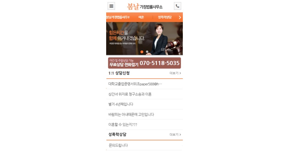 본 사이트의 컨텐츠는 무단으로 복사·게재·배포 등을 금합니다. 상세내용 게시글 본문 일반기업 봄날가정법률사무소 제작기간 2016.03 홈페이지 주소 http://divorce2582.co.kr 홈페이지 타입 Website(웹사이트) / Mobile web(모바일웹) 봄날가정법률사무소 디자인으로 견적상담 받기 🎁무료혜택 확인하기! 25가지 다양한 무료혜택을 확인해 보세요. 검색목록 목록